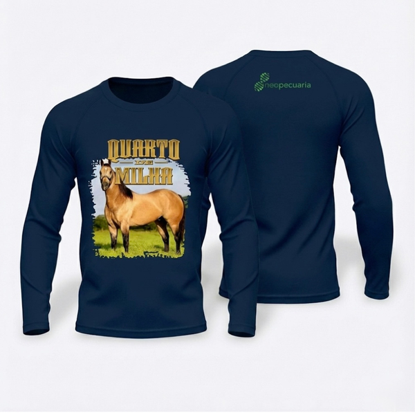 O modelo em azul escuro traz uma estampa exclusiva do cavalo Quarto de Milha, símbolo de potência, equilíbrio e tradição no universo equestre. A logo discreta da Neopecuária nas costas reforça sua autenticidade e estilo agro.